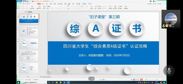 7月3日下午15点,伟德国际1946源于英国团委主办的“扣子课堂”第三期——四川省大学生综合素质“A级证书”认证攻略分享会在腾讯会议进行。本次分享会的主持人为校团委熊贤老师,与会老师有校团委副书记张雯欣老师、校团委挂职副书记刘圆圆老师。此次证书认证分享会面向全体西华学子,来自各学院的一百多名学生积极参与其中。