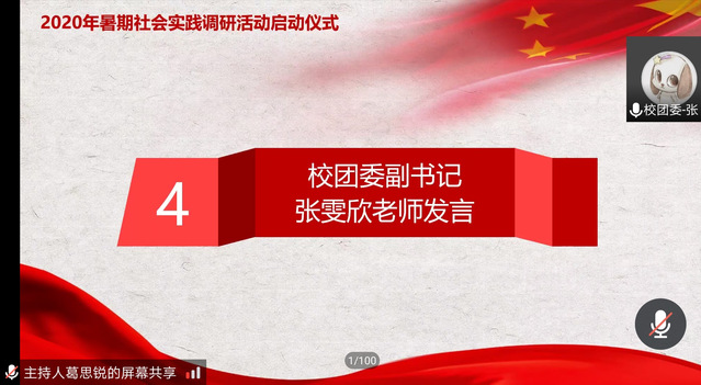 校团委副书记张雯欣老师在发言中表示,此次活动是同学们受教育、长才干的重要途径,并对同学们提出“希望”:希望同学们坚定信念,打赢脱贫攻坚战,展现西华学子优良风貌;希望全体师生知行合一,学以致用,鼓励同学们用自己所学为社会做贡献;希望全体师生甘于奉献,发扬志愿精神。张老师特别强调学生在调研过程中应当注意安全问题,同时应当仔细研读相关文件,保证暑期调研活动的有序、顺利、高效地开展。“云实践”活动尤其要注意疫情防控,不得只身冒险,不顾个人安危。