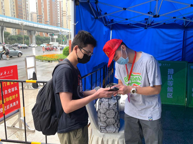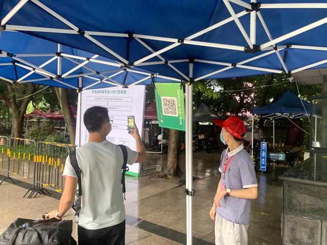 8月15日-17日,是我校第一批学生返校,本次返校学生约1.4万人。在校门口,志愿者们早早地来到南门和西门的志愿服务点,开始了一天的志愿服务,他们热情服务,耐心引导,在校门口负责审核返校学生本人的健康码是否为绿码、是否有符合返校要求的返校凭证、并督促返校学生进校扫描二维码进行返校登记;在学校食堂,志愿者们协助食堂工作人员做好就餐的引导工作,他们在返校工作中用实际行动贡献自己的力量。