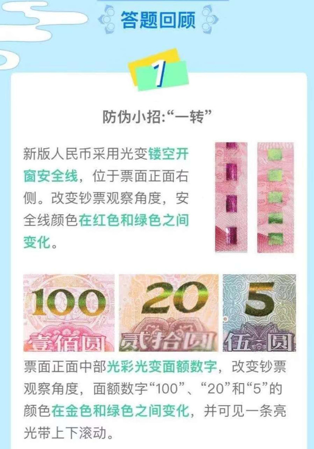 此次知识竞赛从九月初正式启动,历时一个月。至九月底,校内共三百余人参赛。本次竞赛流程为,参赛选手使用手机扫描二维码观看时长为三分钟的第五套人民币防伪知识,根据所学知识自主答题,待回答全部问题,学习完毕所有知识点,即可认为参赛成绩有效,参赛结束。生动的动画短片摒弃了传统知识普及枯燥的宣传形式,用通俗易懂的语言、生动的事例向大学生普及反假币知识,使之在充满趣味的氛围中了解、掌握与生活汲汲相关的知识。
