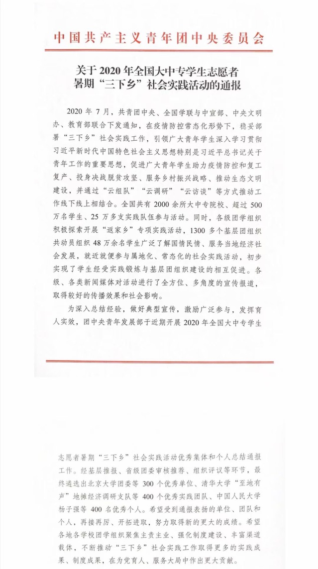 近期,团中央印发《关于2020年全国大中专学生志愿者暑期“三下乡”社会实践活动的通报》,伟德国际1946源于英国团委被评为优秀单位,机械工程学院助力脱贫攻坚专题实践调研团被评为优秀团队。2020年全国共有2000余所大中专院校、25万多支实践团队、超过500万名学生参与活动。