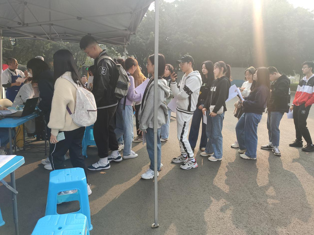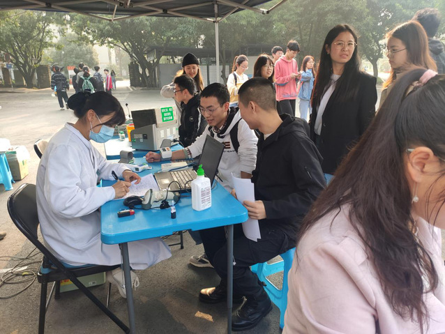 (同学们排队等待验血)