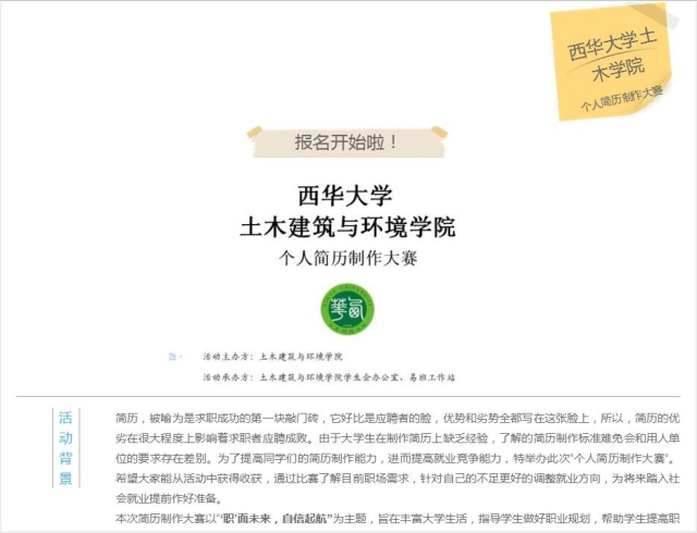 简历,被喻为是求职成功的第一块敲门砖,一个成功的求职者背后必有一份优秀的简历,简历的优劣在很大程度上影响着求职者应聘成败。为了提高同学们的简历制作能力,进而提高就业竞争能力,土木建筑与环境学院主要针对高年级学生开展了简历制作大赛,大赛于11月中旬正式拉开帷幕。本次大赛以“职面未来,自信起航”为主题。