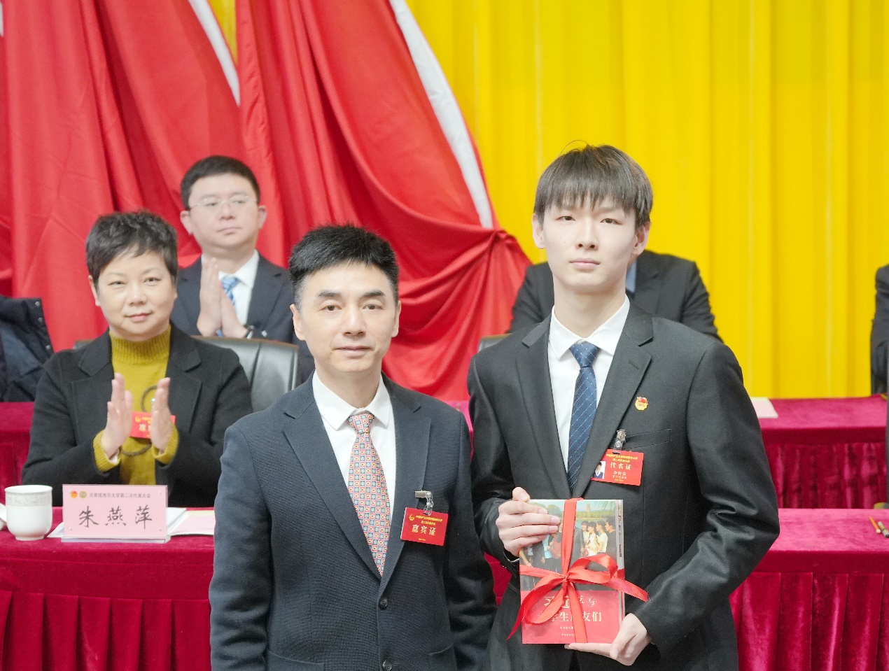 李秋实代表学校党委向团员青年代表赠送《习近平与大学生朋友们》。