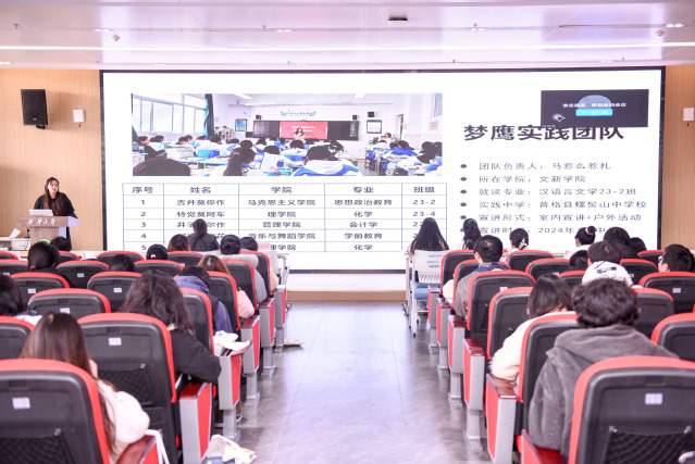 2024年寒假招生宣讲优秀团队代表、文学与新闻传播学院梦鹰实践团负责人介绍了团队工作情况,并结合具体的事例,细致的分享了宣讲经验。