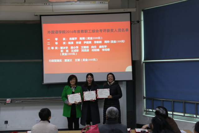 最后,学院党委副书记兼副院长宣读了学院2016年度综合考评获奖人员名单(见下图),并由学院领导为获奖老师颁奖。会上,学院党委副书记兼副院长曾国勇还就2016年学院招生情况与就业情况进行了通报,并号召全院师生关心学院发展,关注关心学生就业问题。