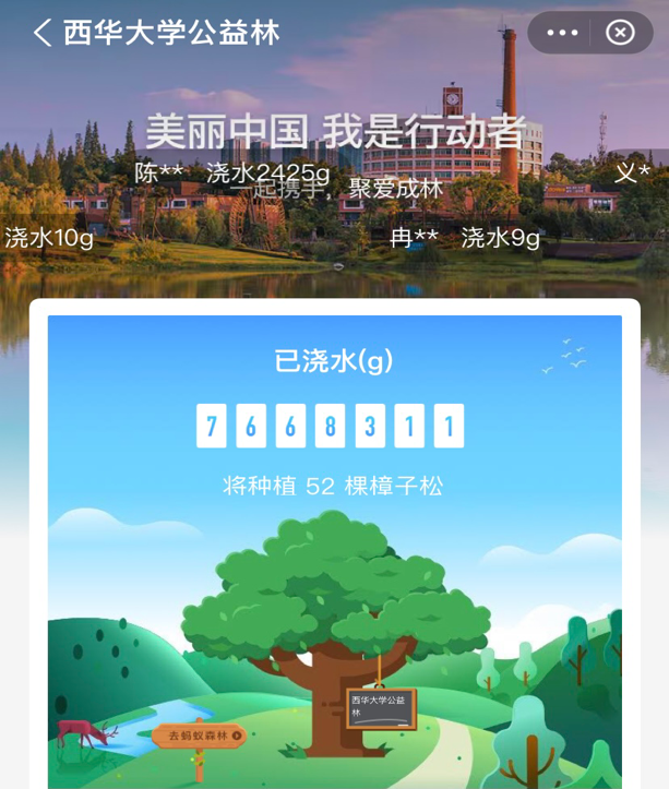 在2021年3月12日植树节当天,“云植树”活动正式开始,同学们都踊跃报名参赛。共有12支队伍、140余名同学参赛。活动期间,个人赛的选手们都纷纷活跃于“伟德国际1946源于英国公益林”的浇水页面,团队赛的选手也在各自创建的“先峰林”中大展身手。截止4月12日零时,“伟德国际1946源于英国公益林”累计浇水量538461克,共累计7.7t能量,相当于线下种植了52棵樟子松。团队赛先锋林共浇水2334283克,共种植云杉5棵华山松1棵。