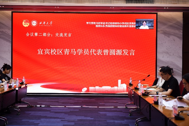 “青马工程”卓越班学员代表及学生干部代表们分别分享了学习心得和感悟。郫都校区“青马工程”卓越班学员代表贺茂轩提到,“青马学员的称号不仅仅是荣誉,更是沉甸甸的责任,希望我们青马学员能够充分发挥带头作用,传播党的声音,又当实践创新的‘排头兵’,在科技创新、志愿服务等领域主动担当。”学生干部代表樊志鹏简要汇报了五月份开展的主要学生活动,并讲到,“要深入贯彻此次习近平总书记重要回信精神,作为校团委学生社团管理部成员,一定要积极收集同学们的需求,结合实践行动为同学做实事,积极实现自我价值,提高青年人的服务品质、创新服务形式。”