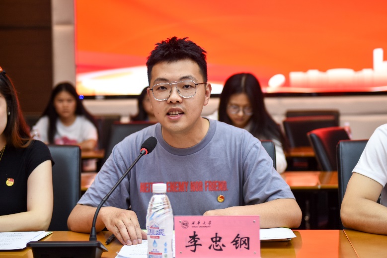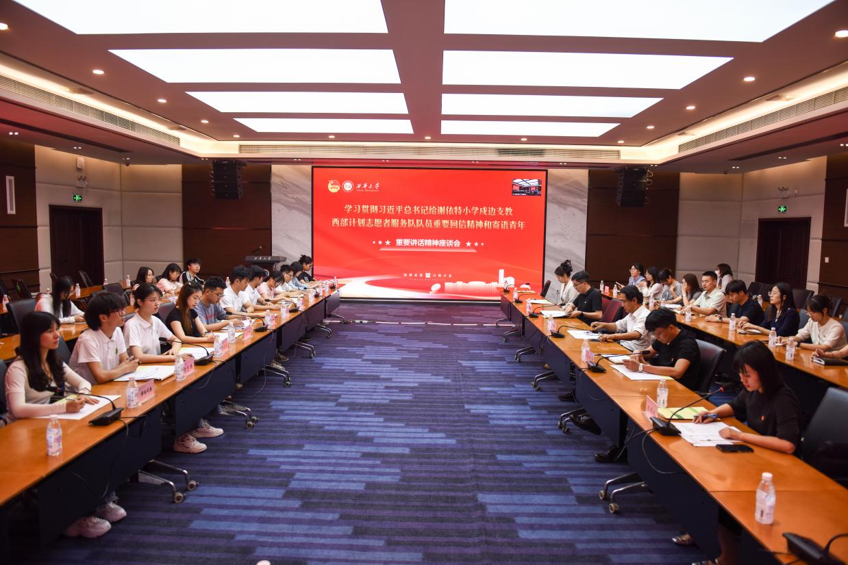 座谈会首先由校团委书记石元鹏领学习近平总书记给谢依特小学戍边支教西部计划志愿者服务队队员重要回信精神和习近平总书记寄语青年重要讲话精神。