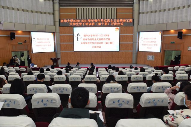 4月9日中午,2020-2021学年青年马克思主义者培养工程大学生骨干培训班正式拉开帷幕。参加本次开班仪式的有校团委兼职副书记陈思雨老师、周雪莲老师、毛雪花老师及全体青年学生干部。首先,学员们齐唱《中华人民共和国国歌》;接着,校团委兼职副书记陈思雨老师带来以“国家的希望在青年,民族的未来在青年”为主题的发言,帮助学员培养国际视野,提高政治素养,加强理想信念教育;学员代表袁玉指出青年大学生要有为实现中华民族伟大复兴而奋斗努力的长远追求;澎湃震撼的《十首歌带你走过党的一百年》视频,带领学员们走过中国共产党百年历程,重温历史超燃瞬间,传承不变红色信仰;紧接着,学员们在冯晓玲同学的带领下进行庄严的宣誓;最后,本次开班仪式在全体老师与学员的合影中顺利结束。