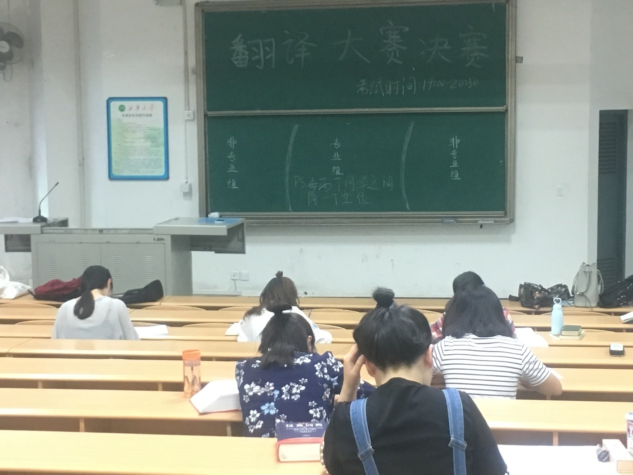 为提高同学们外语学习的兴趣,考察翻译水平,2017517日晚7,由我校外国语学院团委组织部及宣传部主办的翻译大赛决赛于4a307教室举行。