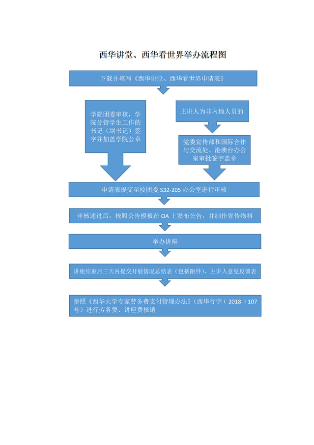 1、根据西华讲堂(西华看世界)申报要求,提前两周确定主讲人及主讲内容,填写申报表,按流程审批;如涉及到国外或港澳台人士讲座,需提前报党委宣传部和国际合作与交流处审批;提供申报要求、申报表格(附件一)。