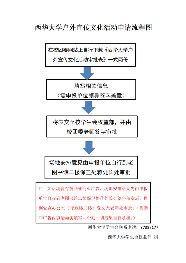 2、审批意见:共青团、学生会、学生社团宣传文化活动由校团委审批;学工系统组织的宣传文化活动由学生工作部审批;校外单位在校内举行的宣传文化活动由党委宣传部审批,宣传部负责校内宣传文化活动总体统筹协调;场地安排意见由保卫处审批。