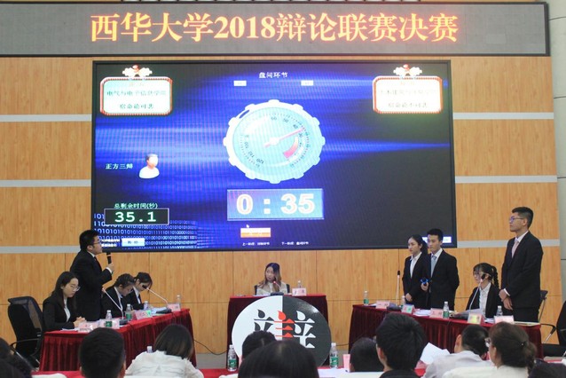 2018年5月9日晚7点,由校团委主办、校学生会学术部和校辩论队承办的2018年校辩论联赛决赛在四教报告厅举行。本次辩论赛决赛特别邀请到了四川大学辩论队教练、2010年第三届世界大专华语辩论队邀请赛冠军、全程最佳辩手罗淼老师,学工部副部长王强老师,发展规划处副处长、知识产权学院、法学院副院长冯永泰老师,管理学院党委副书记谢君老师,马克思主义学院副教授、校辩论队指导教师刘伟明老师担任本场比赛评委,近300名学生观看了比赛。