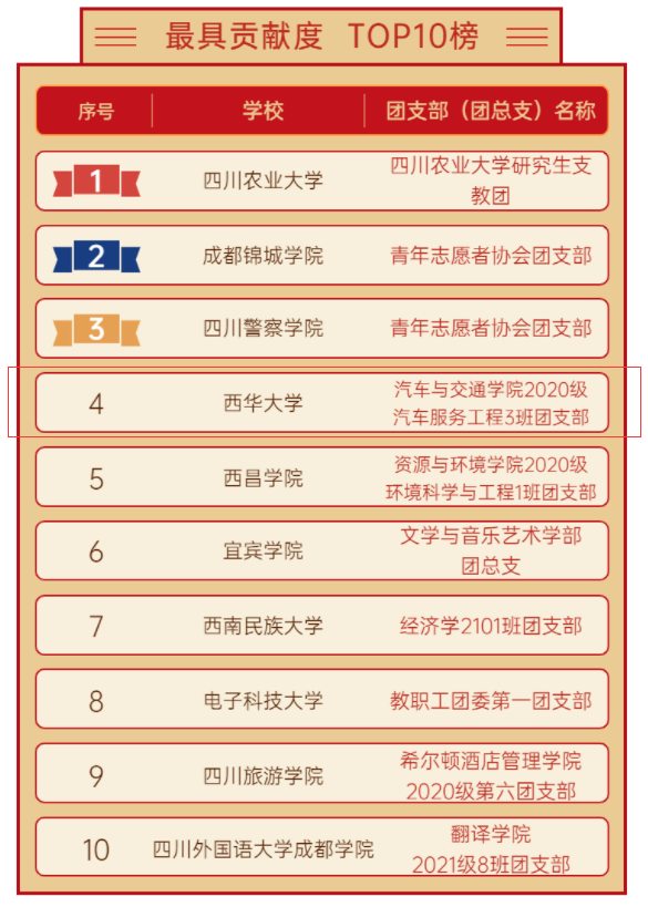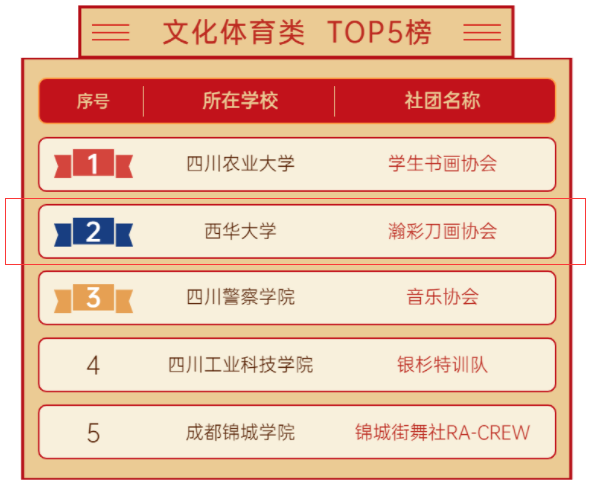 我校瀚彩刀画协会入选文化体育类TOP5榜第二位,全省共27个学生社团入选四川省高校“活力社团”TOP榜。汽车与交通学院2020级汽车服务工程3班团支部入选最具贡献度TOP10榜第四位,全省共60个团支部入选四川省高校“活力团支部”TOP榜。